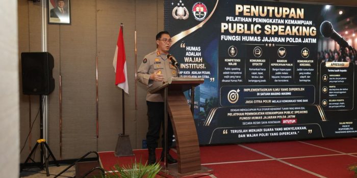 SURABAYA – Bidang Humas Polda Jawa Timur menggelar pelatihan public speaking bagi jajaran Humas dan Pejabat Pengelola Informasi dan Dokumentasi (PPID), Selasa