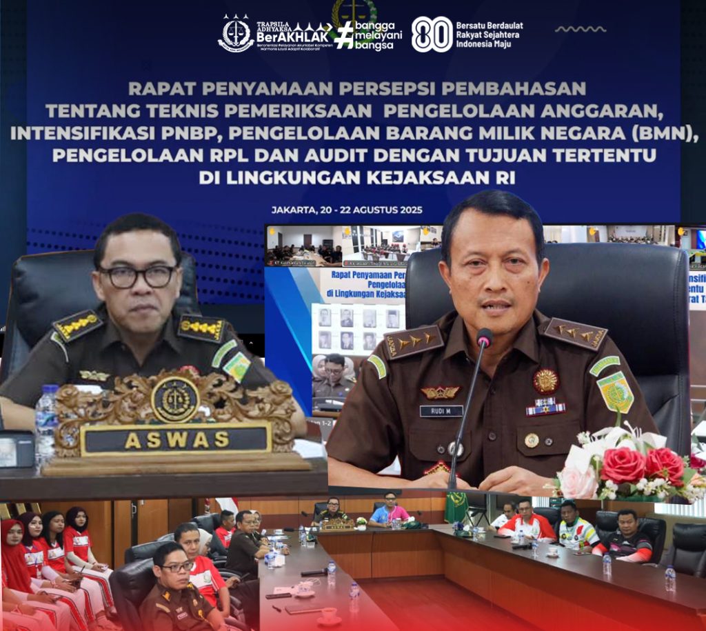 Surabaya – Asisten Pengawasan Kejaksaan Tinggi Jawa Timur, I Ketut Kasna Dedi, S.H., M.H., bersama para Kajari se-Koordinator Surabaya dan pejabat Eselon IV Bidang Pengawasan dan Pembinaan, mengikuti rapat virtual penyamaan persepsi teknis pemeriksaan pengelolaan anggaran, BMN, PNBP, dan audit tertentu di lingkungan Kejaksaan RI, Rabu (20/8/2025), dari Ruang Rapat Lantai 3 Kejati Jatim.