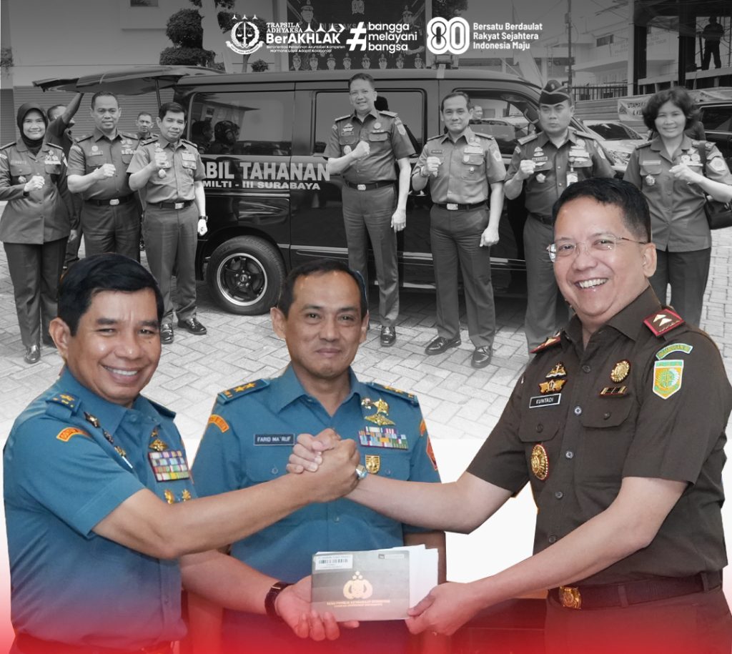 Surabaya – Kejaksaan Tinggi Jawa Timur menunjukkan wujud nyata sinergitas dengan Oditurat Militer Tinggi (Otmilti) III Surabaya melalui penyerahan bantuan satu unit mobil tahanan. Bantuan ini diberikan sebagai dukungan operasional untuk menunjang pelaksanaan tugas dan fungsi Odmilti III Surabaya.