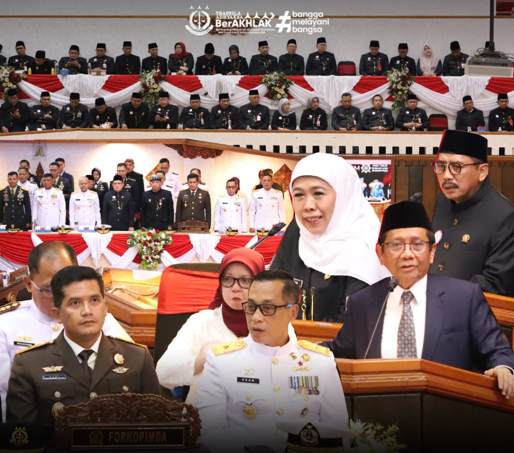 Rangkaian rapat diawali dengan pembukaan oleh pimpinan rapat, dilanjutkan dengan sambutan Ketua DPRD Jatim dan Gubernur Jatim. Dalam sambutannya, Gubernur Jatim menyampaikan apresiasi dan terima kasih atas kolaborasi, ketangguhan, serta kebersamaan seluruh pihak yang menjadi fondasi penting dalam menjaga stabilitas, memperkuat daya saing daerah, dan mendorong pembangunan berkelanjutan.