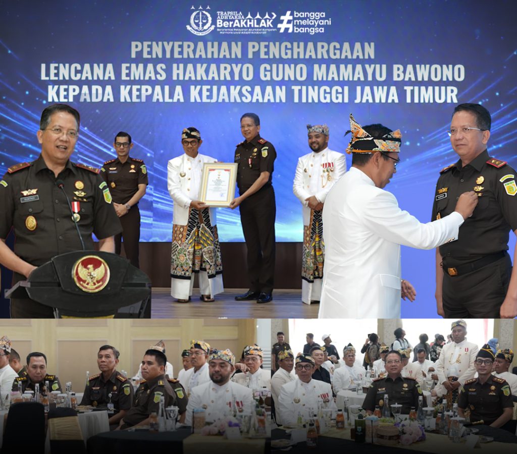 Kajati Jatim, Dr. Kuntadi Terima Lencana Emas “Hakaryo Guno Mamayu Bawono” atas Dedikasi dalam Pendampingan Hukum & Tata Kelola Daerah