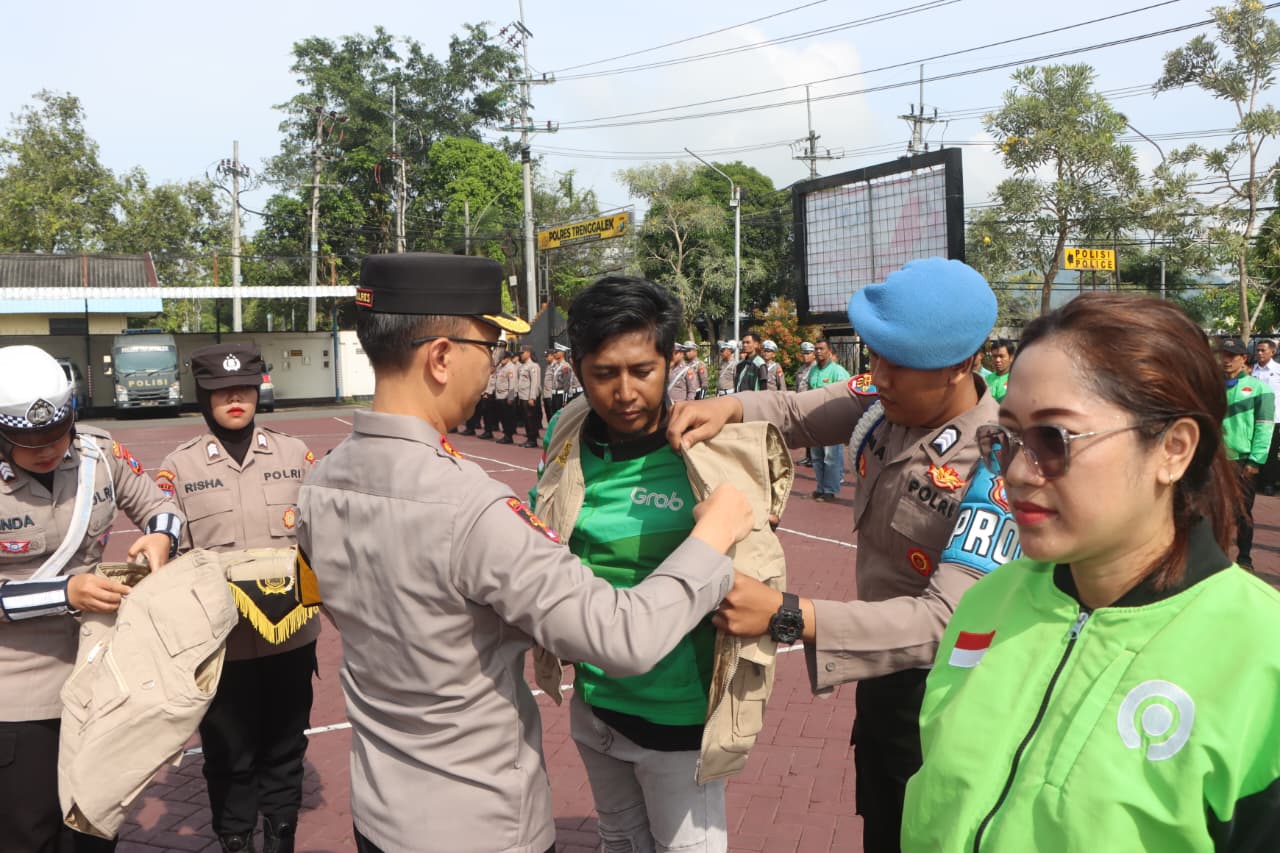 Polres Trenggalek – Ratusan pengemudi ojek online atau yang lebih dikenal dengan sebutan Ojol kompak mengikuti apel bersama di halaman Mapolres Trenggalek. Para pengemudi Ojol menyatakan siap mendukung dan ikut menjaga kondusivitas Kamtibmas di Kabupaten Trenggalek serta aktif menyebarkan pesan positif di jalanan. Jumat, (24/10).