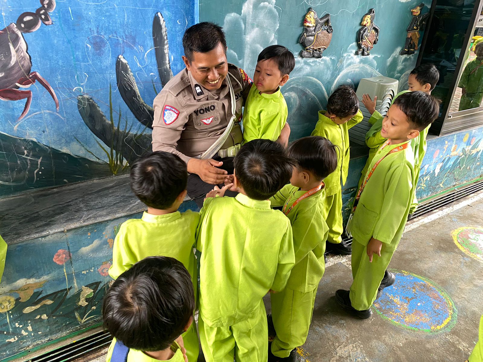 Tak sekadar berkunjung unit yang membidangi edukasi dan penyuluhan tertib lalu lintas ini juga menyapa dan berinteraksi dengan anak-anak. Bahkan, mengajak anak-anak bernyanyi, bermain sekaligus belajar.