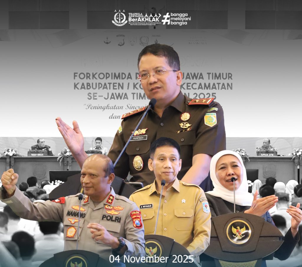 Surabaya – Kepala Kejaksaan Tinggi Jawa Timur, Dr. Kuntadi, S.H., M.H., menjadi narasumber dalam Rapat Koordinasi Peningkatan Sinergitas Menjaga Kerukunan, Keamanan, dan Ketertiban Umum yang diselenggarakan oleh Pemerintah Provinsi Jawa Timur di Grand City Convention and Exhibition Surabaya, Selasa (4/11/2025).