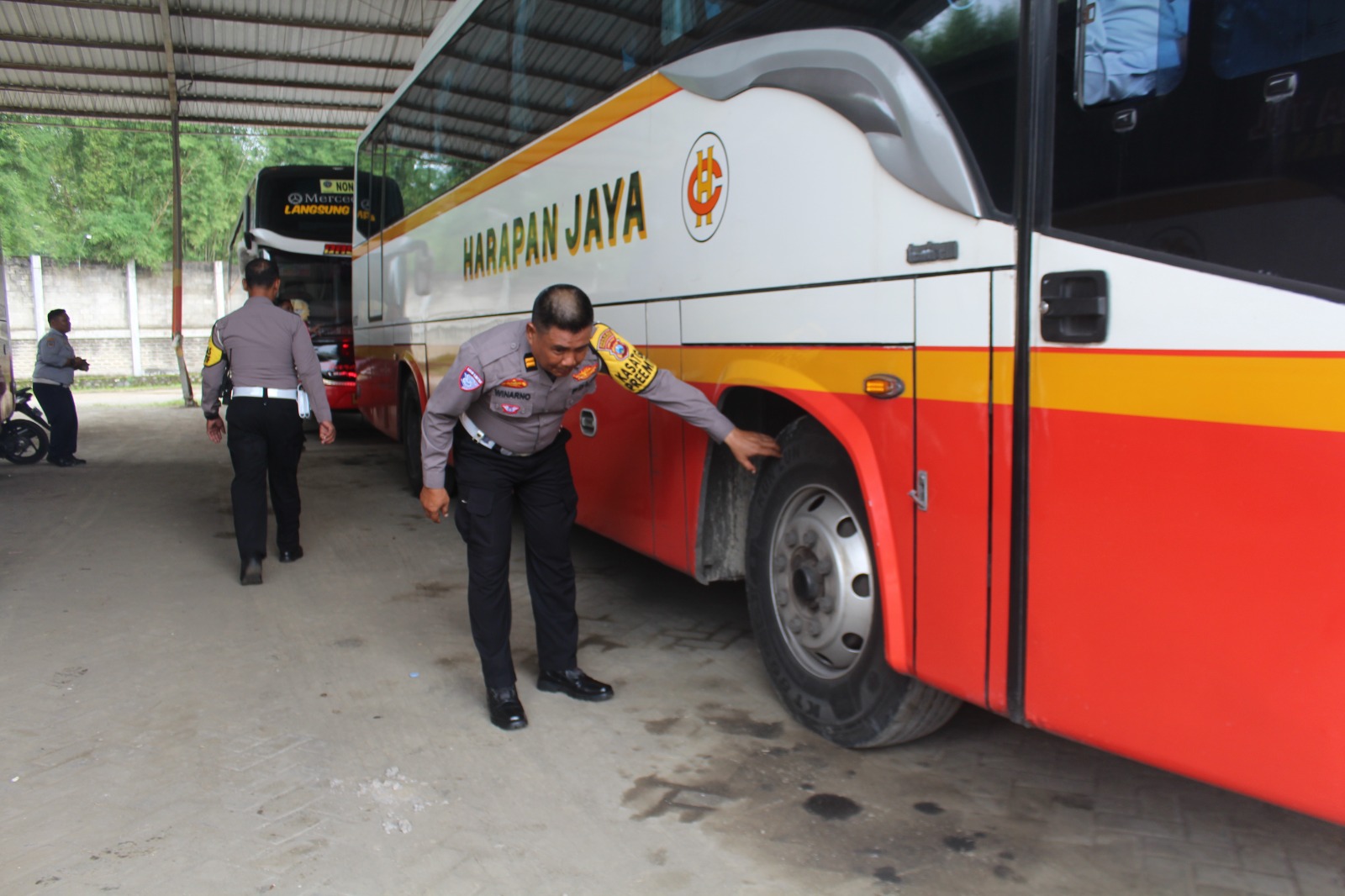 Seluruh kendaraan yang terparkir dalam garasi tak luput dari pemeriksaan perugas. Satu persatu bus diperiksa kelengkapan mulai dari surat-surat kendaraan, kondisi mesin, rem, lampu sign hingga ban serta perangkat keamanan darurat lainnya.