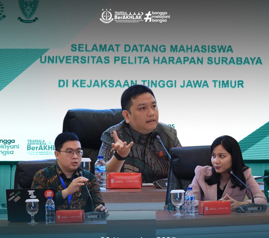 Surabaya – Kejaksaan Tinggi Jawa Timur menerima kunjungan lapangan (site visit) mahasiswa Program Studi Hukum Universitas Pelita Harapan (UPH) Surabaya yang berlangsung di Aula Sasana Adhyaksa, Jumat (28/11/2025). Sebanyak 40 mahasiswa hadir dalam kegiatan ini dengan didampingi oleh dua dosen pengajar.