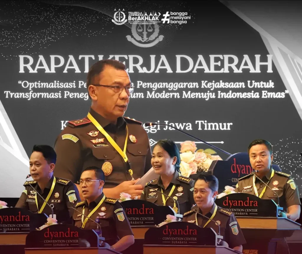 Surabaya – Kepala Kejaksaan Tinggi Jawa Timur, Agus Sahat ST, S.H., M.H., secara resmi membuka Rapat Kerja Daerah (Rakerda) Kejaksaan Tinggi Jawa Timur Tahun 2025 di Dyandra Convention Center Surabaya, Kamis (4/12/2025).