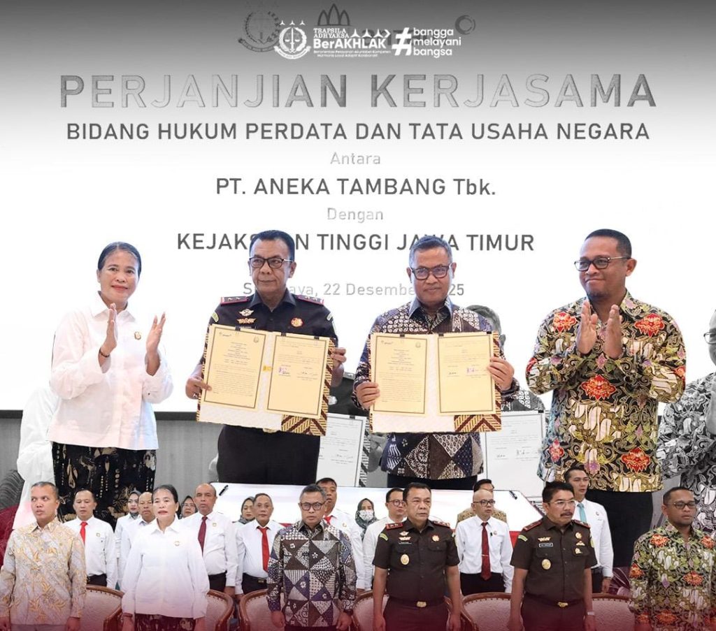 Surabaya – Kejaksaan Tinggi Jawa Timur bersama PT Aneka Tambang (Antam) Tbk resmi menandatangani perjanjian kerja sama di bidang perdata dan tata usaha negara sebagai bagian dari upaya memperkuat sinergi dan kepatuhan antara lembaga penegak hukum dan BUMN yang berlangsung di Aula Sasana Adhyaksa, Senin (22/12/2025).