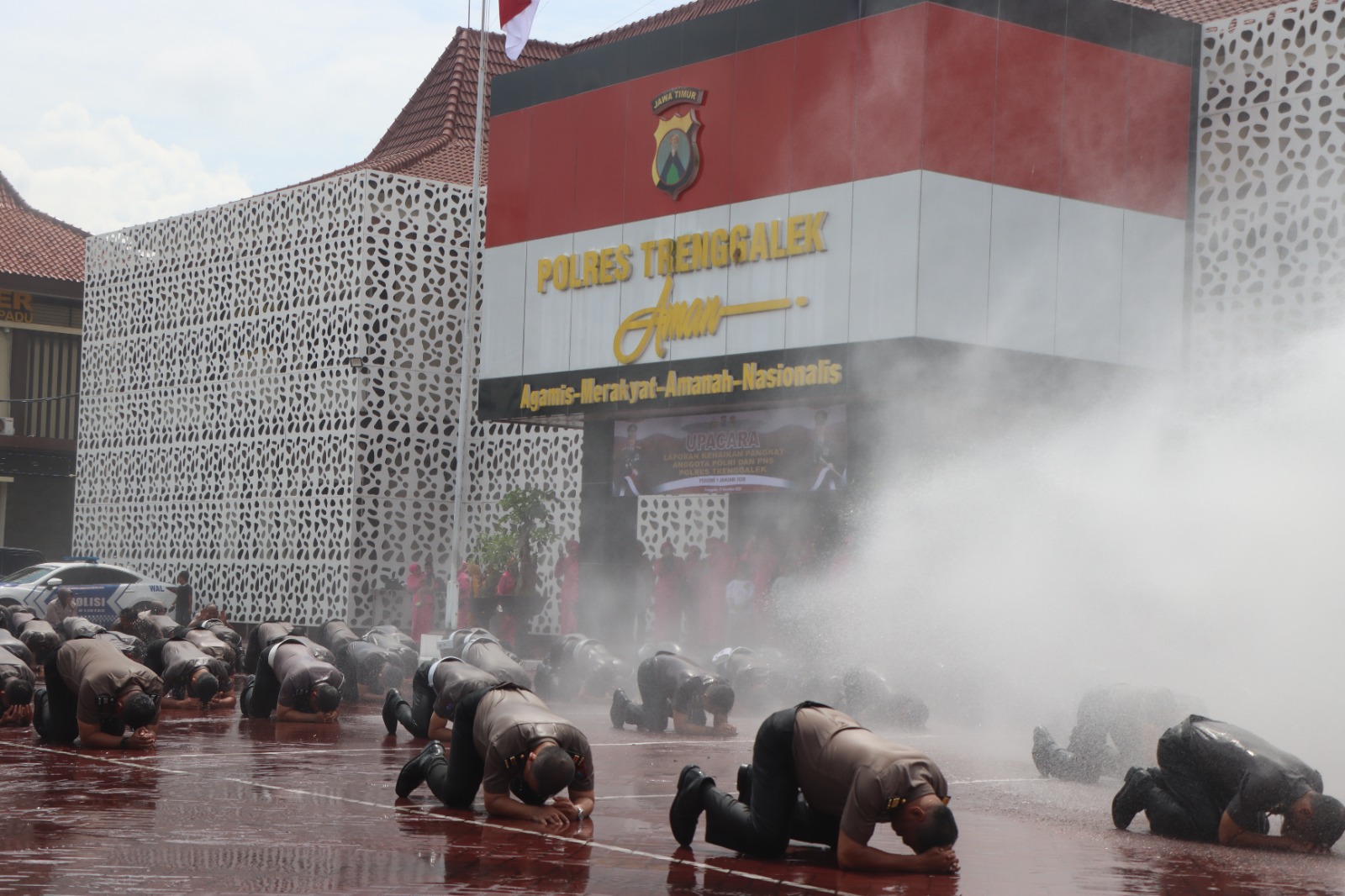 Bukan itu saja, sebagaimana tradisi tahun-tahun sebelumnya, semua anggota yang naik pangkat mendapat kejutan istimewa. Dengan mengambil sikap sujud seluruh anggota disemprot air menggunakan mobil Damkar yang sudah disiapkan.