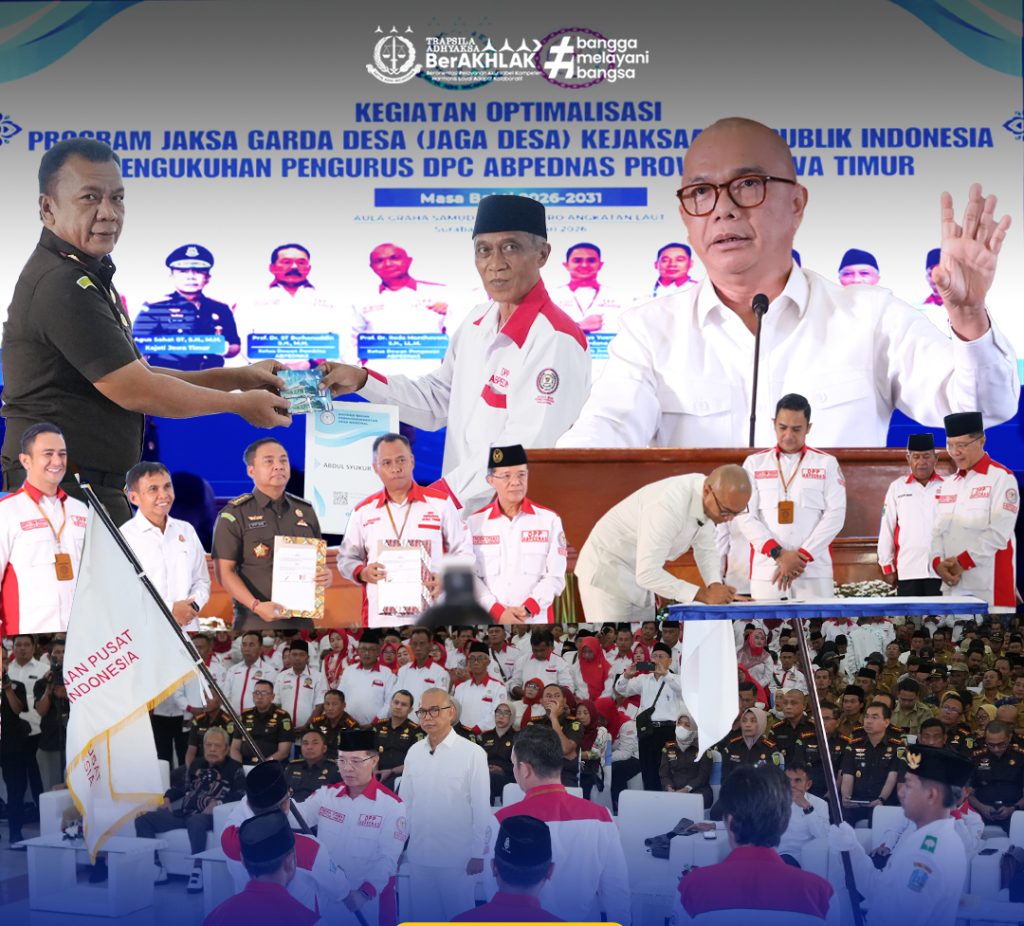 Surabaya – Jaksa Agung Muda Intelijen (JAMINTEL), Prof. Dr. Reda Manthovani melaksanakan kunjungan kerja ke Provinsi Jawa Timur dalam rangka penguatan implementasi Program Jaksa Garda Desa (Jaga Desa) serta pengukuhan DPC Asosiasi Badan Permusyawaratan Desa (ABPEDNAS) se-Jawa Timur yang berlangsung di Graha Samudera Bumimoro, Selasa (24/2/2026).
