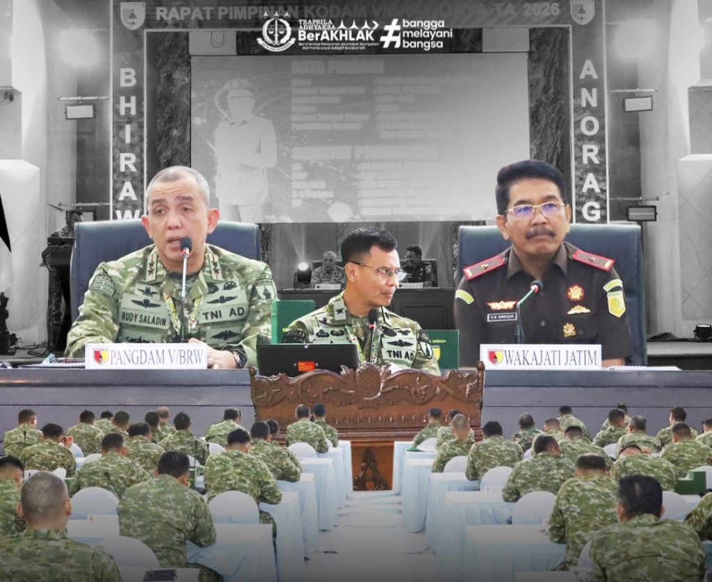 Surabaya – Kepala Kejaksaan Tinggi Jawa Timur yang diwakili oleh Wakajati Jatim, Saiful Bahri Siregar, S.H., M.H., menghadiri dan memberikan arahan khusus dalam Rapat Pimpinan Kodam V/Brawijaya Tahun Anggaran 2026 di Gedung Balai Prajurit Makodam V/Brawijaya, Selasa (3/3/2026).